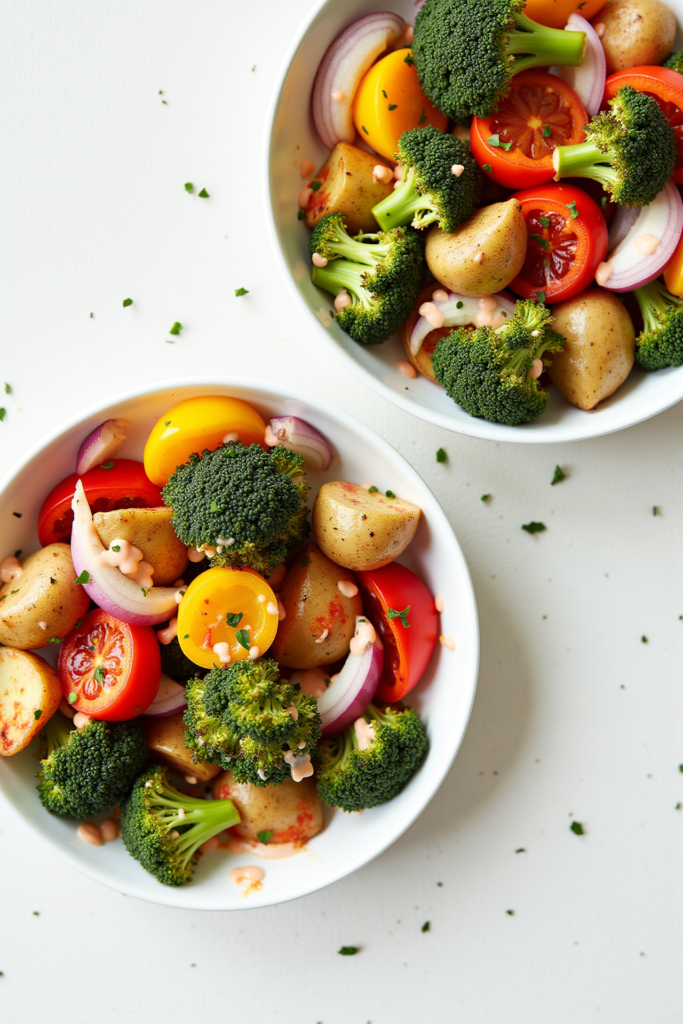 For the most colorful bowl, look for a mix of vegetables: red bell peppers, purple onions, bright orange carrots, vivid zucchini, golden squash, and deep green broccoli florets. Cut them into even pieces for uniform roasting. Toss with olive oil, salt, pepper, and a sprinkle of smoked paprika or your favorite herbs for extra flavor. Roast at a high temperature until edges are caramelized and deeply flavorful.