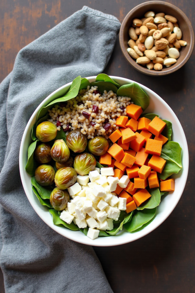 Start by choosing your favorite sturdy grain—quinoa, farro, or brown rice are all excellent options. Cook according to package instructions. While the grains simmer, toss cubed sweet potatoes and Brussels sprouts in olive oil, salt, and pepper, then roast them in the oven until golden and tender. This roasting step brings out their deep autumn flavors and irresistible caramelization.