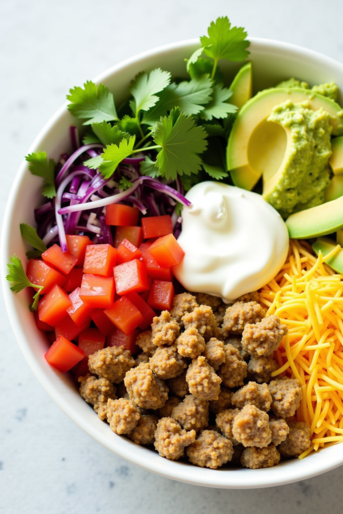Start with protein: brown lean ground meat or tofu, then toss in seasonings like cumin, chili powder, and garlic. Add scrambled eggs for extra protein power. Pile on loads of nutrient-rich toppings: crisp lettuce, tomatoes, crunchy peppers, onions, and a scoop of hearty salsa. A sprinkle of cheese or a dollop of Greek yogurt ties it together—no tortilla required.