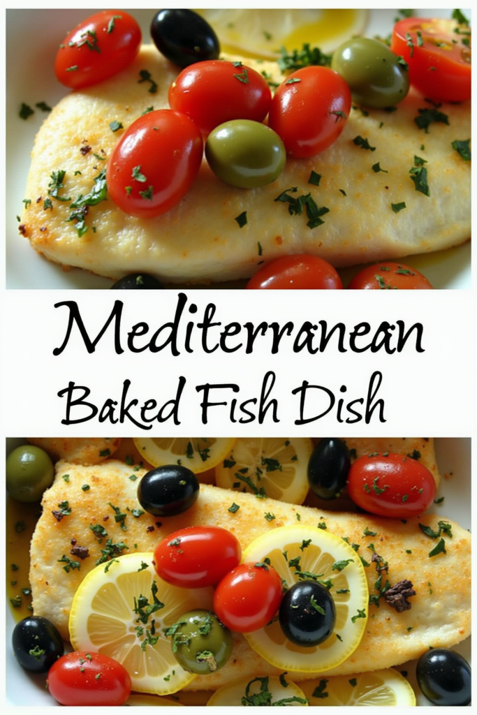 Pair your Mediterranean Baked Fish with simple sides like steamed couscous, herbed rice, or a fresh green salad. Roasted vegetables or a warm pita are great accompaniments, and a dollop of Greek yogurt adds a creamy, tangy finish. This dish is equally at home at a weeknight dinner table or as a centerpiece for casual entertaining.