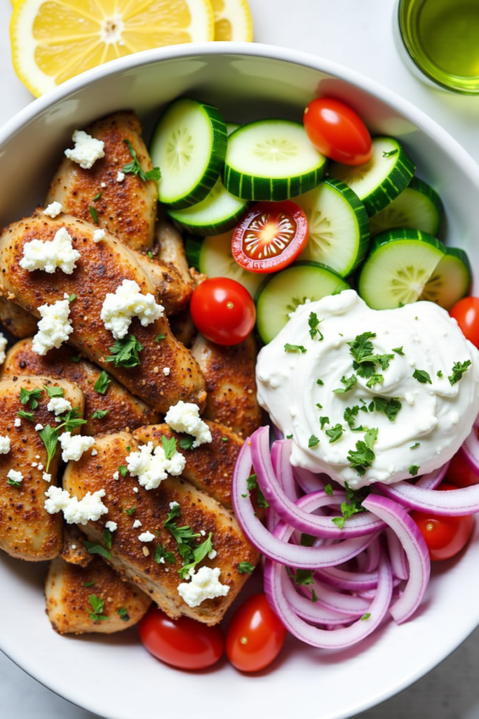 5. Assemble the bowls: Start with a bed of rice or quinoa. Add sliced chicken, a dollop of tzatziki, and spoonfuls of cucumber salad. Top with optional feta cheese and pita wedges.