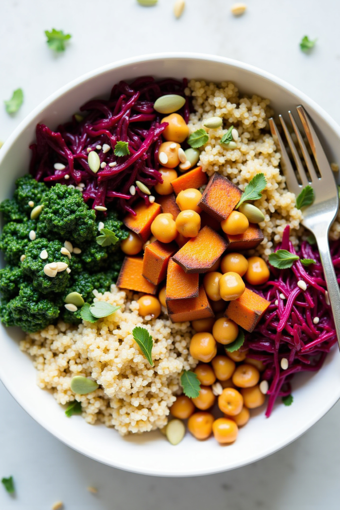 For best results, roast your sweet potatoes until caramelized and tender. If preparing chickpeas, toss them in a bit of olive oil, cumin, and smoked paprika before roasting for extra crunch and flavor. Prepare the grains ahead of time to streamline assembly. While the sweet potatoes cook, whisk together the lemon-tahini dressing for a creamy, tangy finish.