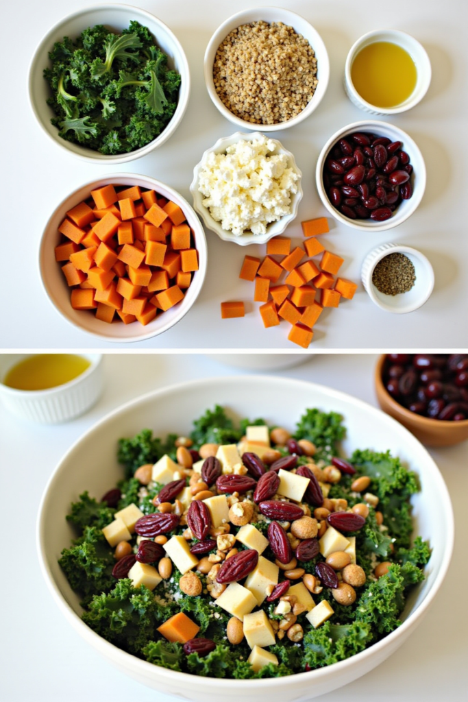 - Build the bowl: Layer massaged kale and cooked wild rice as the base. Top with roasted sweet potato, apple, chicken, goat cheese, and almonds.