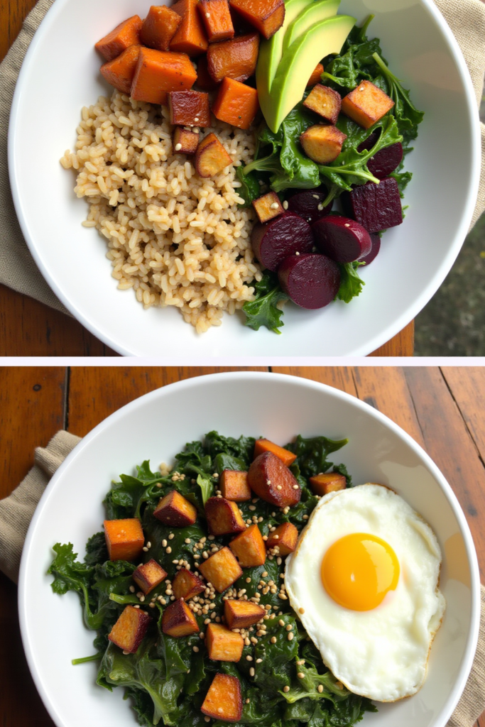 - Assemble individual bowls: Add a base of wild rice. Top with kale, roasted sweet potatoes, diced apple, shredded chicken (or chickpeas), goat cheese, and roasted almonds.
