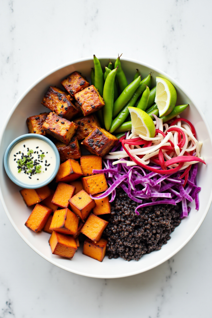 Start by layering a base of hearty brown rice or quinoa, then top with colorful vegetables like shredded red cabbage, julienned carrots, edamame, and fresh greens. Roasted sweet potato and creamy avocado elevate the bowl, while a sprinkle of sesame seeds adds crunch. The rainbow of veggies isn’t just beautiful—it’s a simple way to eat a greater variety of vitamins, minerals, and antioxidants.