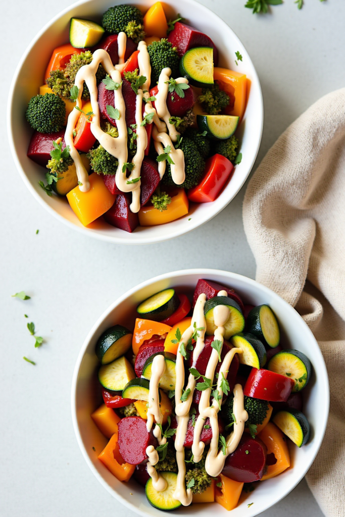 To build the perfect bowl, start with a generous scoop of cooked quinoa or brown rice as your base. Top with colorful rows of your roasted veggies, add a handful of crisp greens (like spinach or arugula), and a dollop of hummus or tzatziki. Drizzle with your favorite vinaigrette or tahini dressing, and garnish with seeds or fresh herbs for a final flourish.